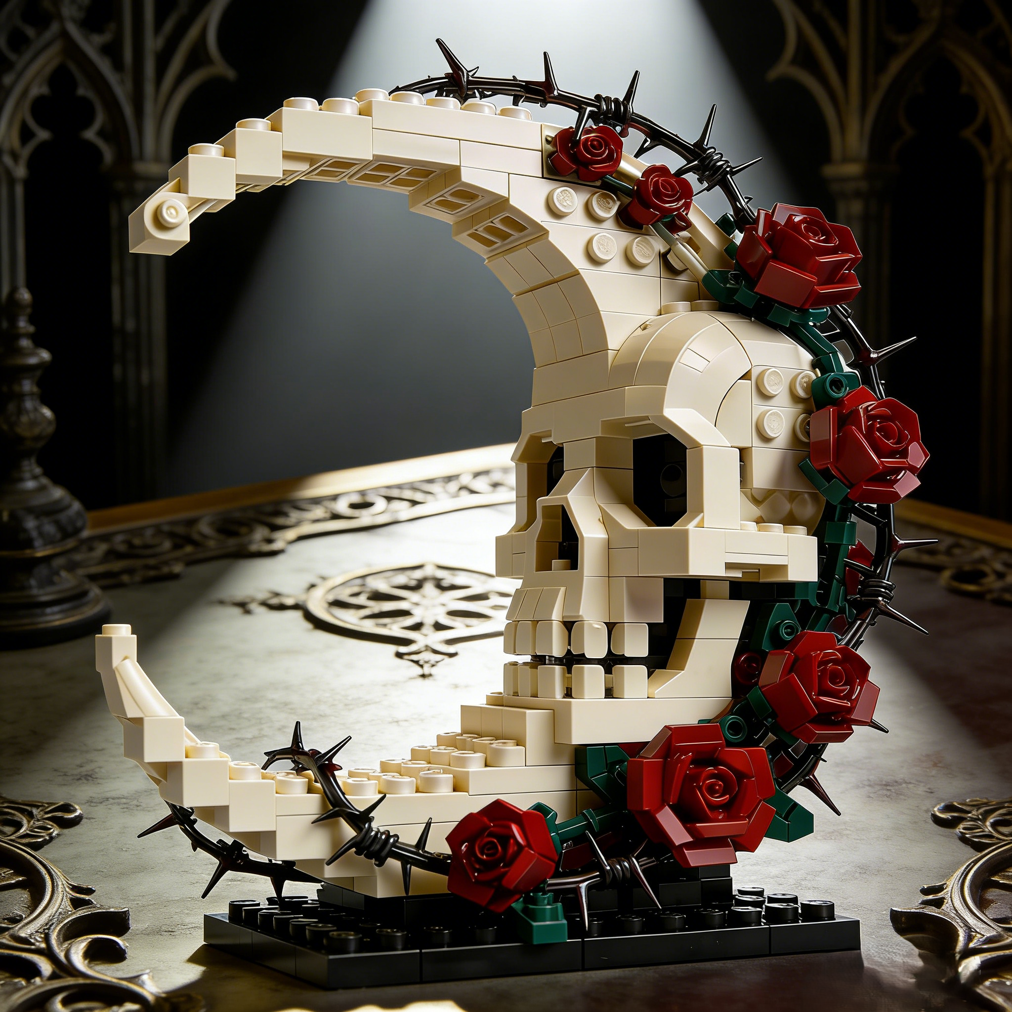 a skull shaped by time, cradled by a crescent moon, wrapped in thorns and blooming roses.